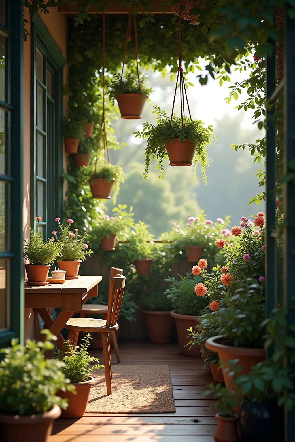Vertikale Nutzung: Wandmontierte Elemente wie hängende Pflanzgefäße und schmale Regale schaffen Stauraum ohne Bodenfläche zu verbrauchen.