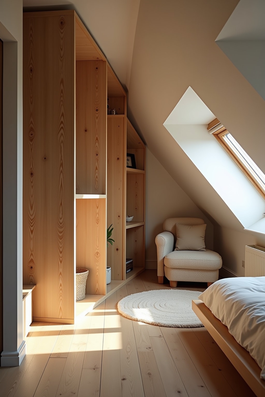Maßgefertigte Möbel nutzen den verfügbaren Raum unter Schrägen optimal aus und verwandeln ungenutzte Nischen in wertvollen Stauraum.
