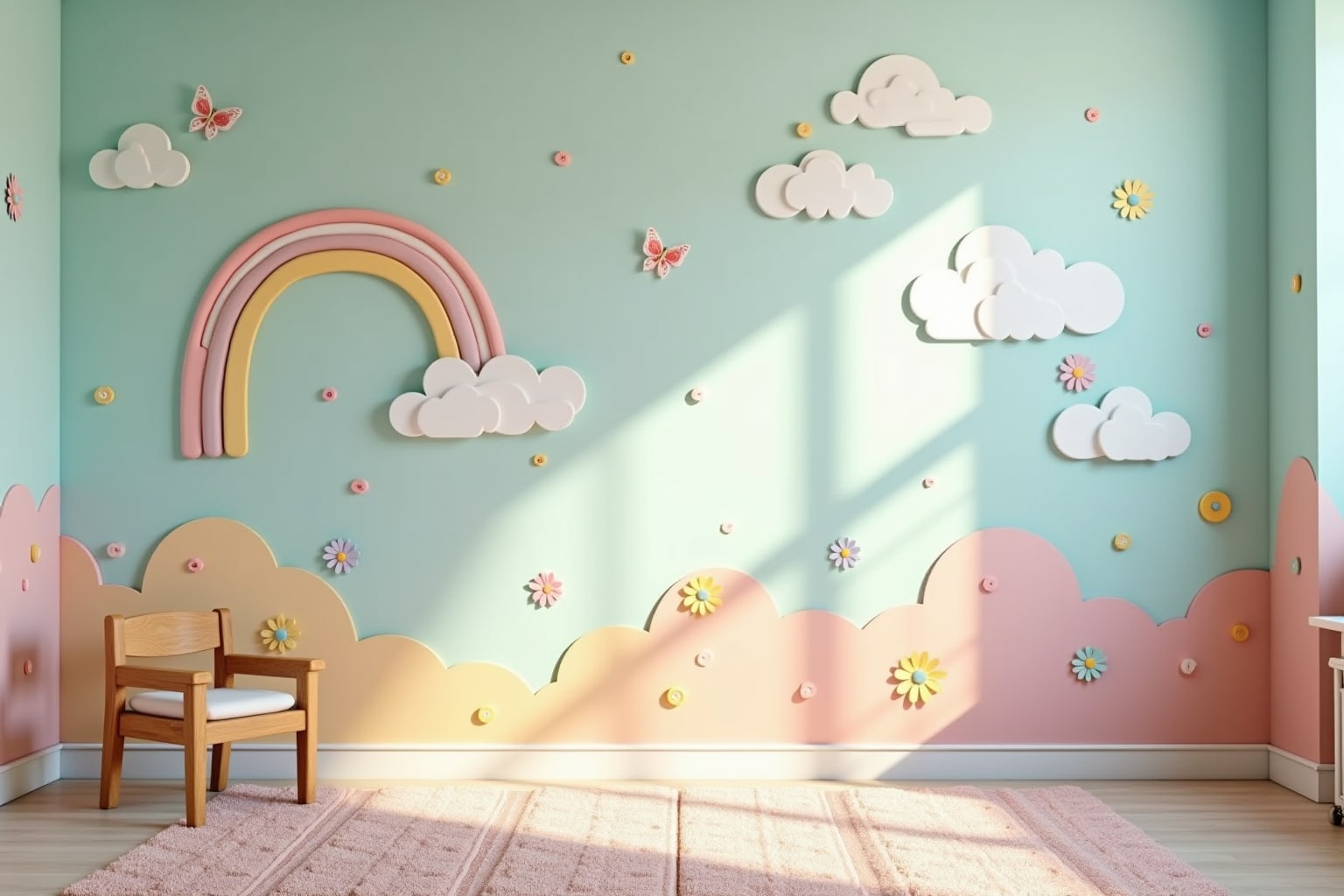 | Muster & Motive | Dekorative Elemente wie Sterne, Blumen, Tiere, Regenbögen | Kleinkinder und Grundschulkinder | Flexibel durch Wandsticker oder Schablonen, kann sich mit dem Kind ändern. |